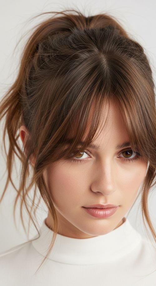 Curtain bangs pair beautifully with messy ponytails. Tie your hair back loosely and let the bangs fall naturally. This frames your face and softens the overall look. You don’t need to style the bangs heavily—just a quick brush or finger adjustment works. It’s a simple way to make your ponytail feel more styled without extra effort.
