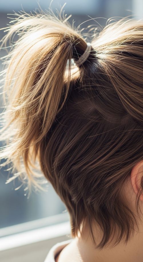 Even short hair can work. Gather what you can into a small ponytail and let shorter pieces fall naturally. Use bobby pins if needed. The messy look actually helps blend uneven lengths.
