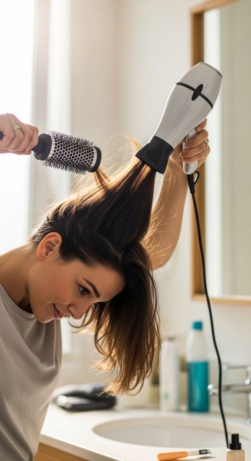When drying your hair, focus on creating lift at the roots. Blow-drying upside down helps build natural fullness, while a round brush smooths and shapes the hair. Make sure your hair is completely dry before curling because damp strands struggle to hold shape and are more vulnerable to heat damage.