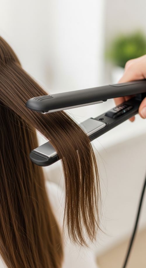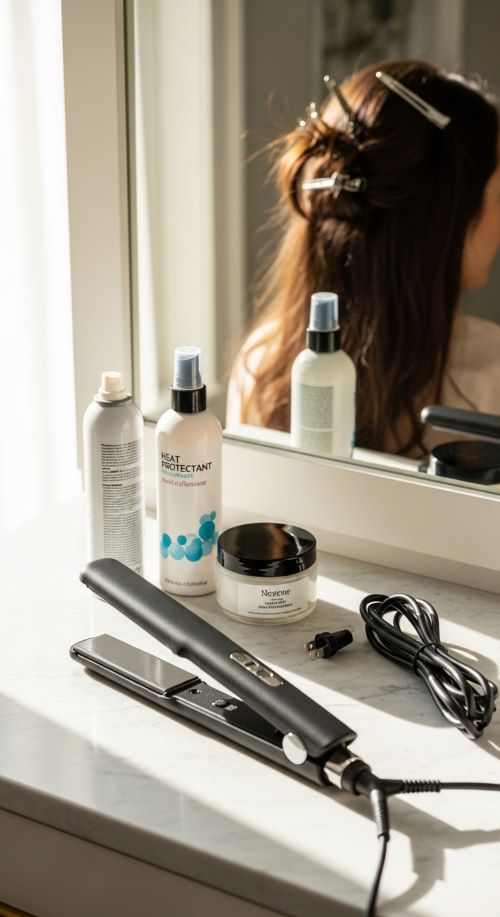 Begin with completely dry hair. Flat irons and damp hair don’t mix — trapped moisture can cause sizzling, frizz, and damage. Apply a heat protectant evenly from mid-length to ends, then brush through to distribute the product and remove tangles. Section your hair into manageable layers so you’re not fighting through thick chunks, and clip the rest neatly out of the way.