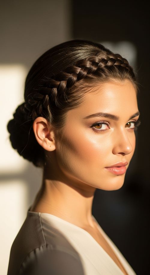 15. Low Bun with Braided Headband Accent