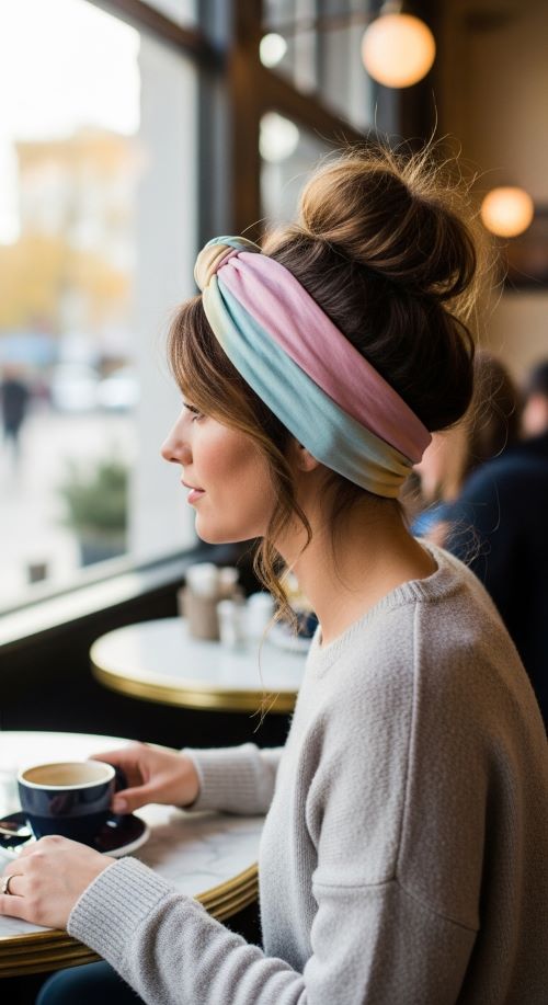 Pull your hair into a loose messy bun at the crown. Place a knotted headband around your head, tucking a few strands underneath for a relaxed effect.