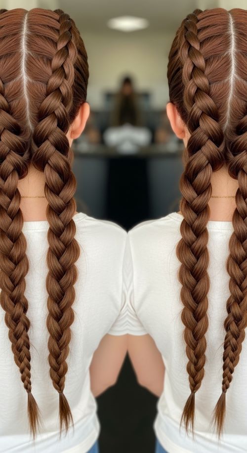 Mirror the first braid on the opposite side of your head. Ensure that both braids are tight at the top for a neat look and evenly sized. Once both braids are secured, you can leave them as two separate braids or combine them at the ends for a creative twist.