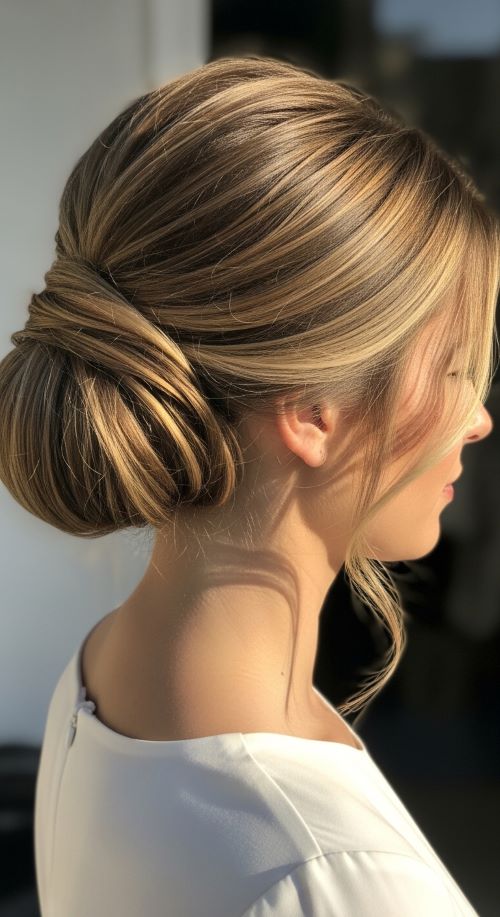 The low side chignon is simple and chic. Gather hair to one side and roll it into a loose bun, securing with bobby pins. Allow a few strands to fall freely for softness. This hairstyle is great for medium to long hair and can be dressed up or down. Budget-friendly tip: Use pins you already own and skip expensive styling sprays. It’s ideal for casual evenings, lunch dates, or low-maintenance office looks