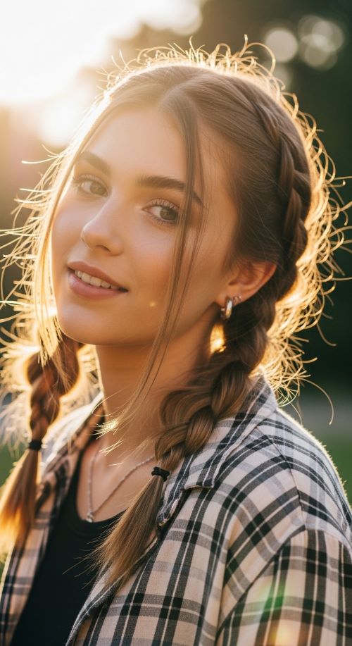 Double braids are practical and playful. Part your hair down the middle and braid each side loosely, securing with small elastics. Slightly pull sections of the braids to make them fuller and more relaxed. Budget-friendly tip: Use elastics you already own. This style keeps hair out of your face and is ideal for long days, casual errands, or outdoor activities. You can dress it up by adding small ribbons or keep it simple for everyday wear. Double braids work for medium to long hair and add a touch of charm to any outfit.