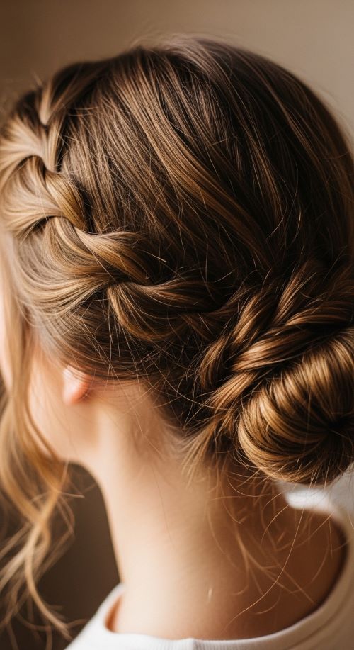 The braided bun combines two easy techniques for a polished look. Start with a braid and wrap it into a low or mid bun, securing with pins. Messy edges add natural charm. This style is great for medium to long hair and keeps your hair secure all day. Budget-friendly tip: Use bobby pins instead of fancy clips for a secure hold. You can make it sleek by tightening the braid or casual by loosening strands. Ideal for work, casual events, or a quick change from day to night.