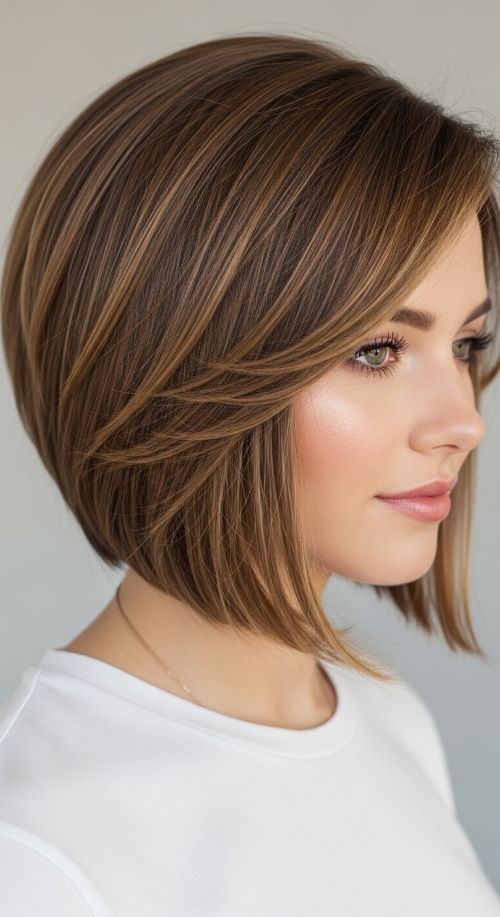 An inverted bob adds shape and movement to fine hair. The stacked layers at the back give the illusion of fullness, while the front remains longer for framing. Blow-dry each layer individually to enhance volume and add shine. This cut is stylish yet practical, requiring minimal daily styling. Fine hair tends to look thicker with this structured approach because the layers create natural lift and shape.