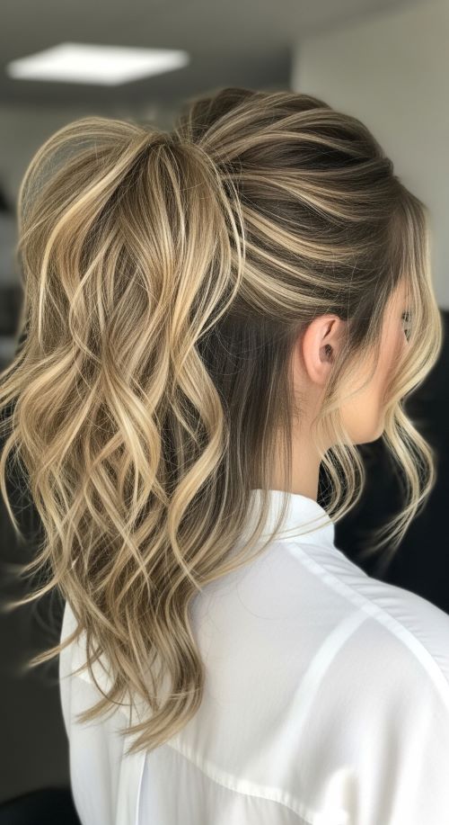 Soft waves create a relaxed but elegant look. Start by using a curling wand to create loose waves throughout the hair. Pull the hair into a ponytail once the waves are finished. Leave a few strands loose near the front to frame the face. A little sea-salt spray adds texture and movement. The result looks natural while still feeling styled.