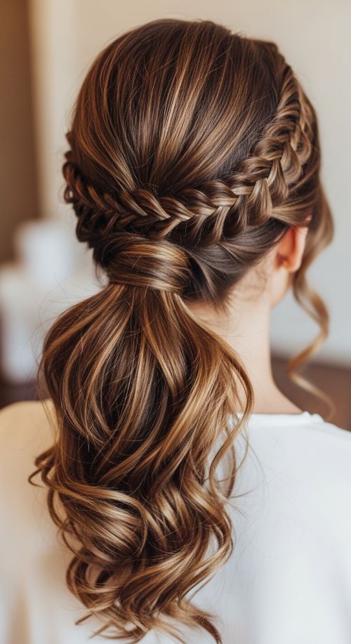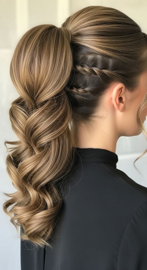 A braided accent adds detail without making the style complicated. Begin by braiding a small section of hair near one temple. Secure the braid temporarily with a clip. Gather the rest of the hair along with the braid into a ponytail. Remove the temporary clip and blend the braid into the ponytail. Curl the ponytail slightly for softness. This style feels romantic and works well for events or parties.