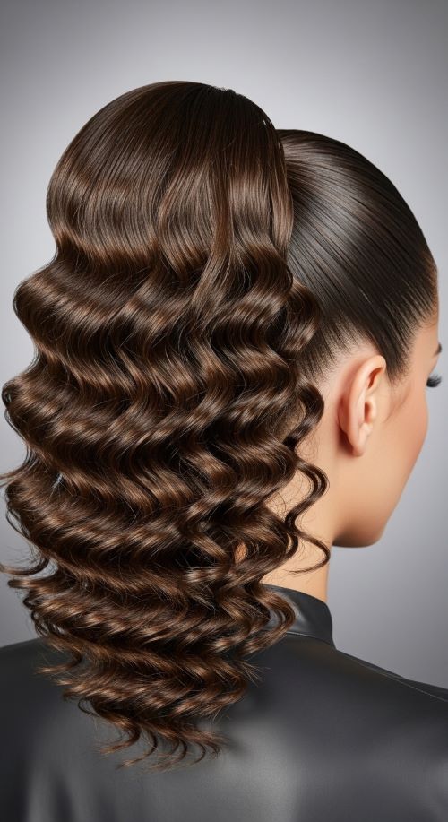 A deep side part instantly adds drama to a ponytail. Start by creating a sharp side part using a comb. Smooth the hair using a brush and styling cream. Pull the hair into a low ponytail at the nape of the neck. Curl the ponytail length into loose waves so it falls gracefully over the shoulder. The deep part adds structure and helps frame the face. A small amount of shine serum keeps the surface smooth. If the hair feels flat near the crown, tease that section slightly before securing the ponytail. This small lift balances the dramatic side part.