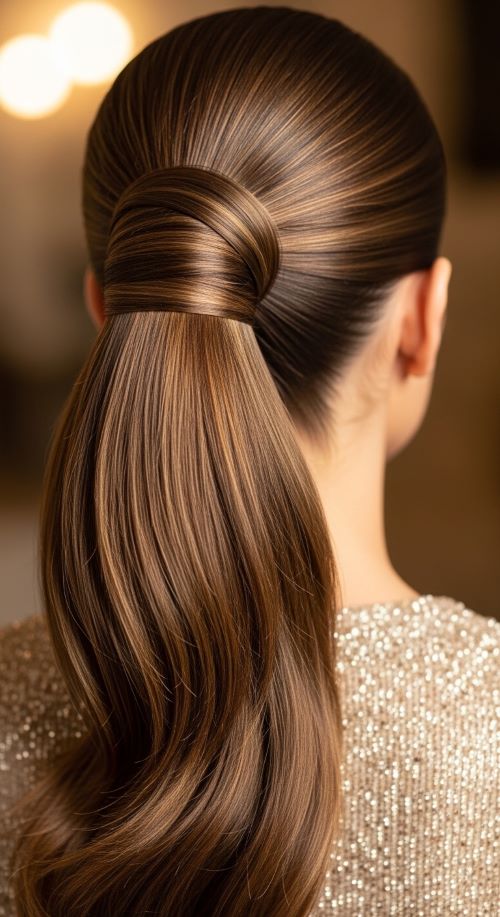 The sleek straight ponytail focuses on shine and smoothness. Begin by straightening the hair with a flat iron. Apply a small amount of smoothing serum to reduce frizz. Gather the hair into a mid-height ponytail and secure it tightly. Wrap a thin section of hair around the elastic for a polished finish. This style works well with statement earrings or bold makeup because the hair stays neat and simple. A shine spray can add a glossy effect without making the hair greasy.