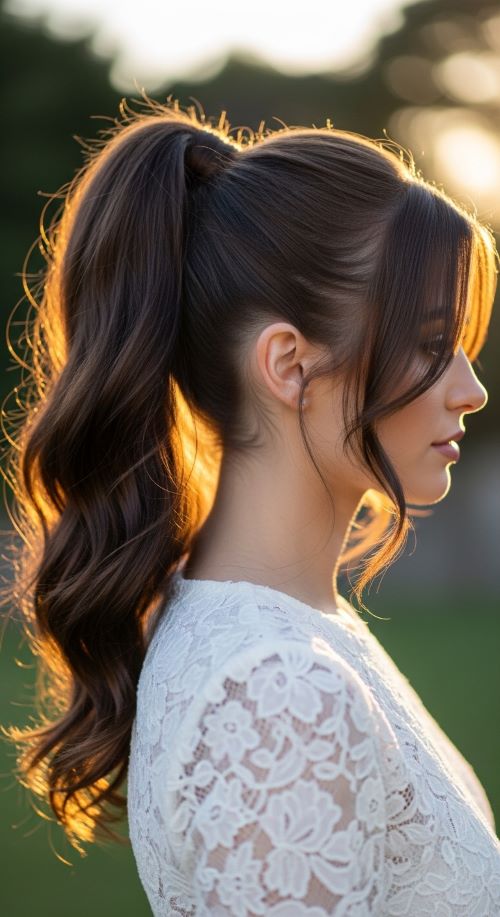 A ponytail with bangs can feel soft and elegant. Begin by styling the bangs with a round brush so they fall naturally across the forehead. Pull the rest of the hair into a mid-height ponytail. Loose curls in the ponytail help balance the softness of the bangs. If your hair does not have bangs, you can create a similar effect by pulling a few strands forward near the hairline. A light mist of hairspray helps the bangs stay smooth without looking stiff. The combination of structured ponytail and soft fringe creates a flattering shape. This hairstyle works well for both casual outfits and dressier occasions.