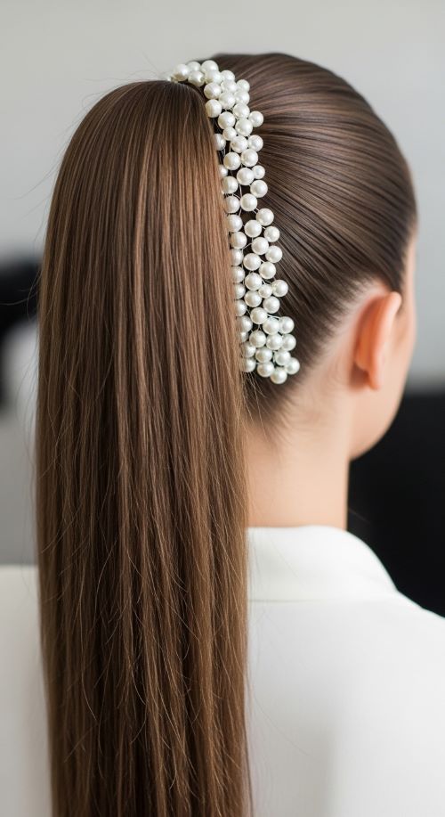 Pearl pins can transform a simple ponytail into a glamorous style. Begin with a sleek mid-height ponytail. Smooth the hair with a brush and apply a small amount of styling cream to control flyaways. Once the ponytail is secured, place pearl hair pins along one side of the head. You can position them in a straight line or scatter them for a softer look. The pearls reflect light and add a refined touch without needing complicated styling. Curl the ponytail ends slightly for added movement. Affordable pearl pins are easy to find in beauty stores or online. Even inexpensive sets can look beautiful when arranged carefully. This hairstyle pairs well with evening outfits or formal dresses while still being easy enough to recreate at home.