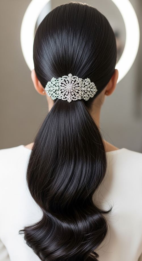 A statement clip adds sparkle and personality. Begin with a sleek ponytail positioned at the crown or mid-head. Choose a decorative clip with crystals or metallic details. Attach the clip just above or beside the elastic. The accessory becomes the main feature of the hairstyle. Keep the ponytail smooth or add soft curls depending on the look you want. Even affordable clips from local stores can look beautiful when placed carefully. This simple addition makes the hairstyle feel event-ready without much effort.