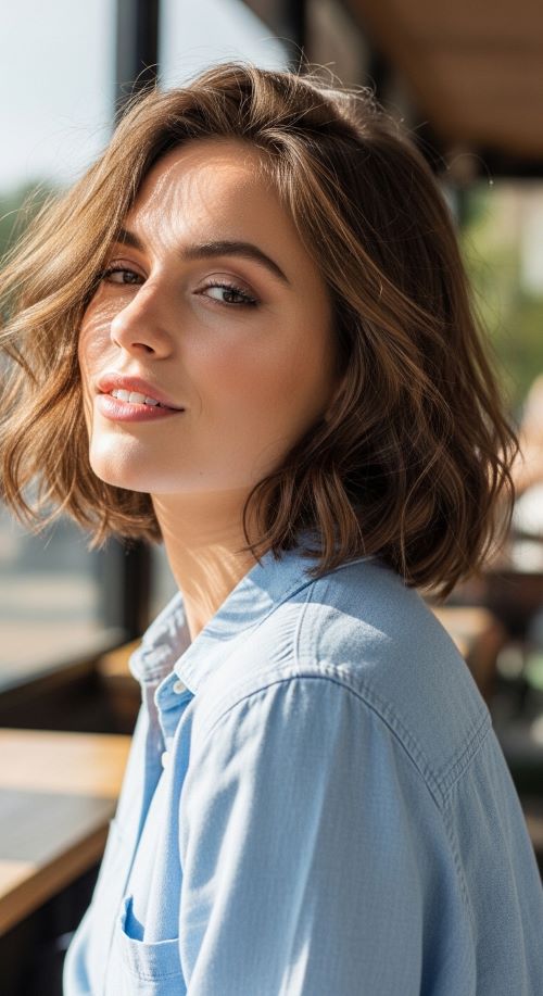 A chin-length bob is a bold yet practical option for thick wavy hair. By cutting the hair shorter, you remove a large amount of weight, which makes your waves easier to control and style. This length frames the face nicely and gives a fresh, clean appearance. To avoid the hair puffing out too much, light layering is usually added. This helps the waves fall more naturally instead of creating a bulky shape. Styling this cut is quick and simple. Apply a lightweight curl cream or leave-in conditioner, then scrunch your hair and let it air dry. Because the length is shorter, it dries faster and requires less product. This makes it a great choice for anyone who wants to save time during their daily routine while still keeping a stylish look.