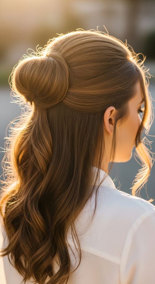 The half-up style combines volume with length. It keeps hair away from the face while still showing movement.