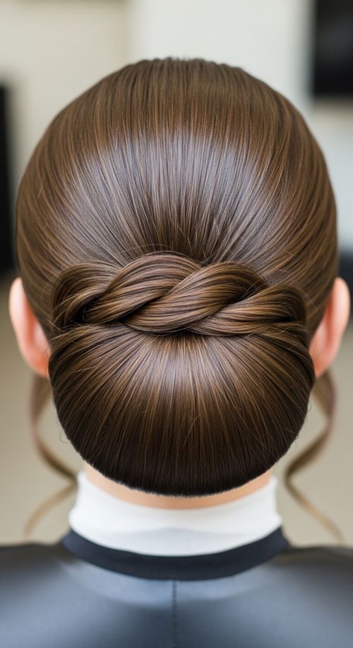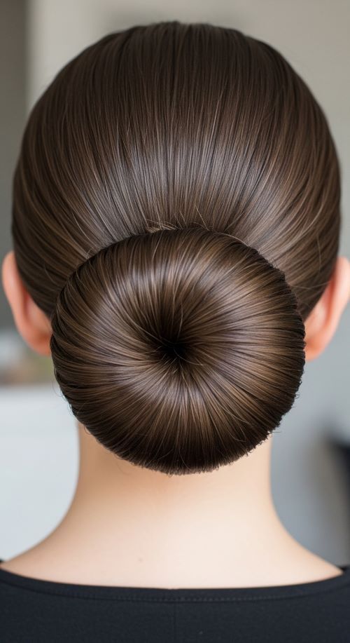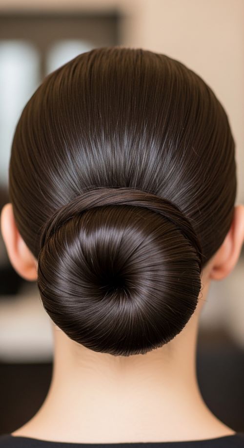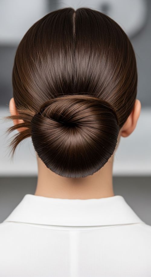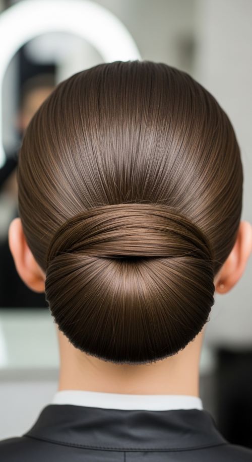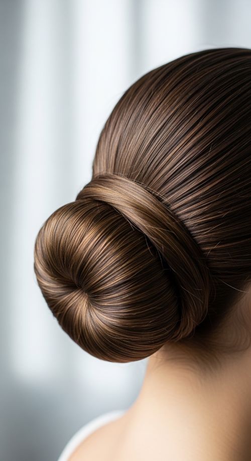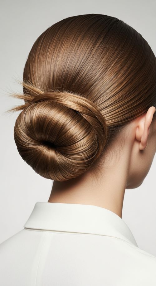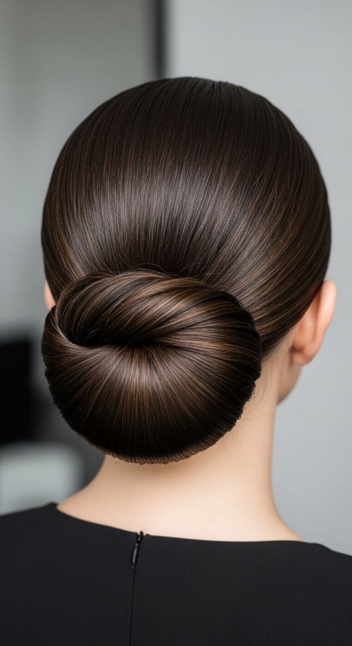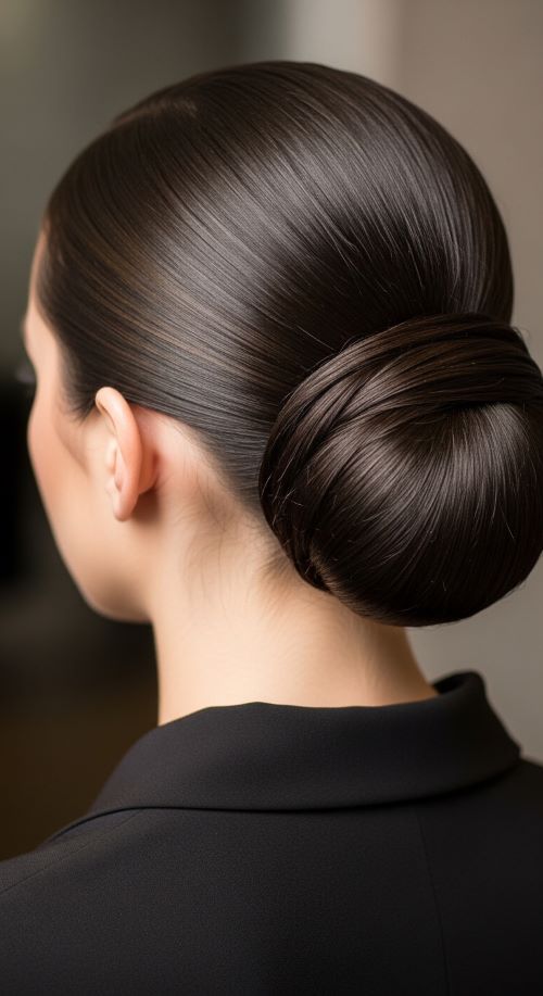This style works especially well on day-old hair because it holds better. If your hair feels slippery, a little dry shampoo at the roots adds grip. For a budget option, a tiny amount of hand lotion can smooth flyaways just as well as styling cream. This bun pairs easily with office wear, simple jewelry, or evening outfits.