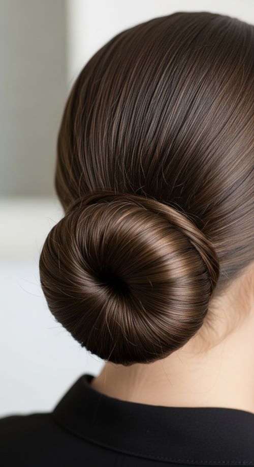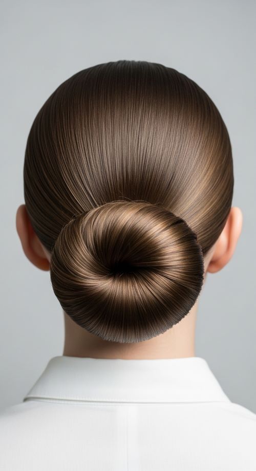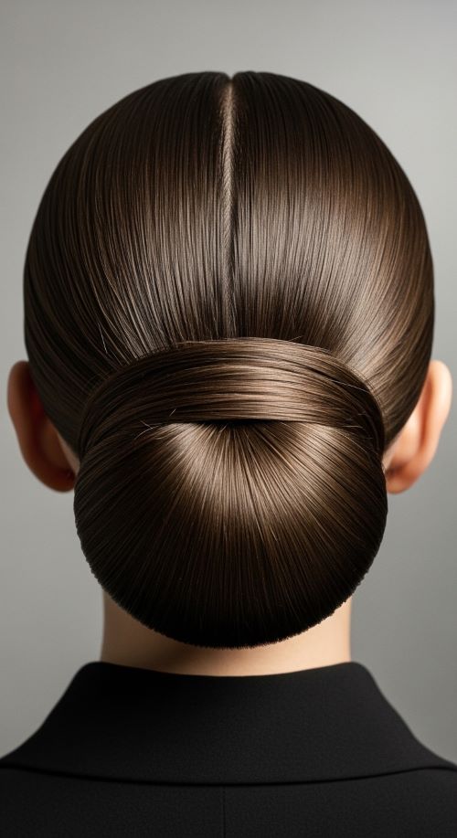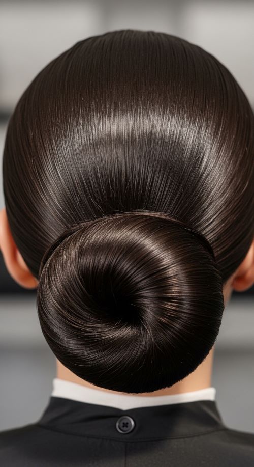 This bun stays simple but polished. Add a touch of shine to the surface and keep the shape compact.