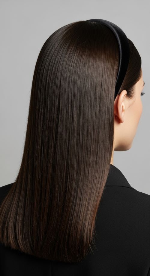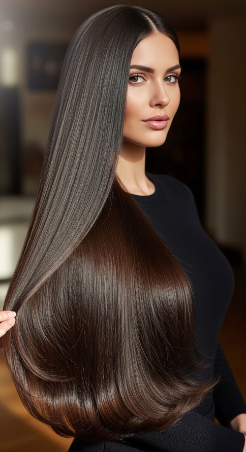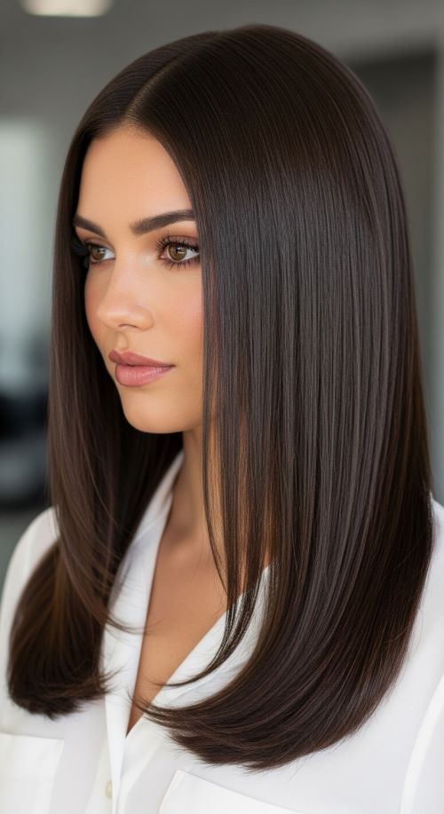 Long layers add movement while keeping the sleek appearance intact. Ask for subtle layers rather than heavy shaping. Blow-dry using a paddle brush to stretch strands smoothly. Apply heat only where needed instead of repeatedly straightening all hair. Budget tip: divide hair into two large sections rather than many tiny ones if you’re short on time. A light serum helps layers separate naturally without frizz. Trim split ends regularly because damaged tips break the smooth effect. This hairstyle suits both casual and dressy looks. Tie the front layers back for variation or leave them loose around the face. The overall result looks effortless yet polished.