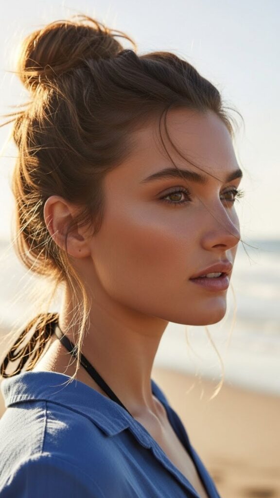 Gather your hair into a loose top knot. Let ends stick out. This bun works with salty, wavy hair. No brush needed. If your hair tangles, finger comb and tie. A little coconut oil on the ends keeps them soft. This style is simple and easy for travel.