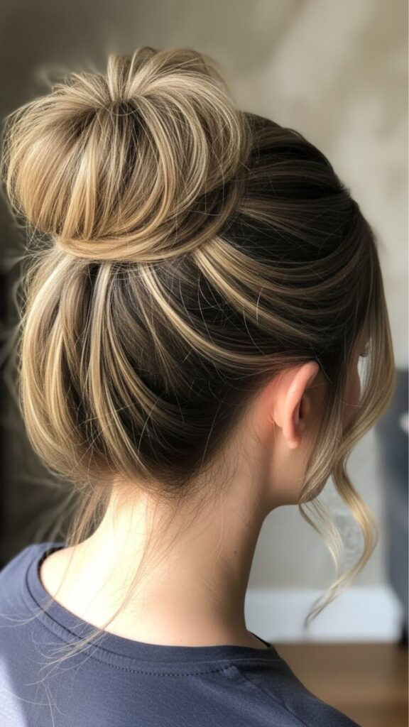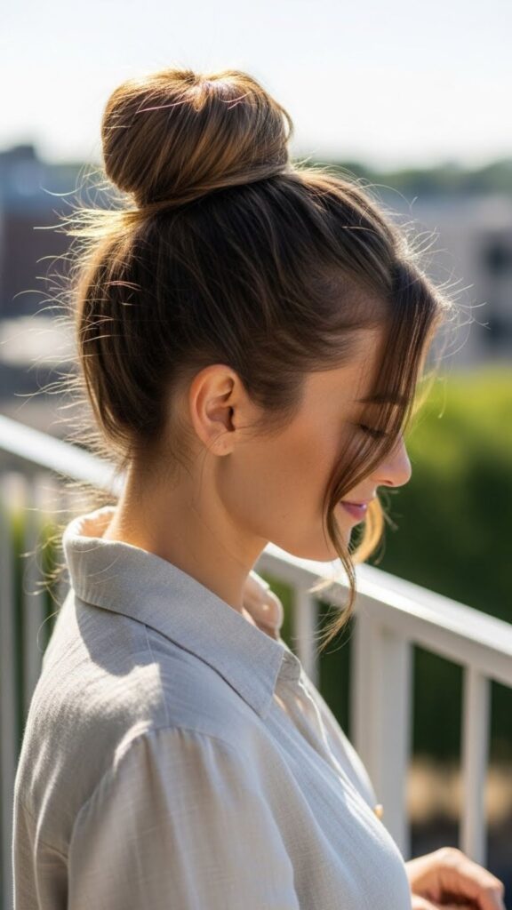 The high top knot is quick, fun, and great for warm days. Flip your head upside down and gather your hair at the crown. Secure with a hair tie. Twist the ponytail and wrap it around itself. Pin it in place. Pull gently at the sides of the bun to make it look fuller. This takes ten seconds and makes a big difference.