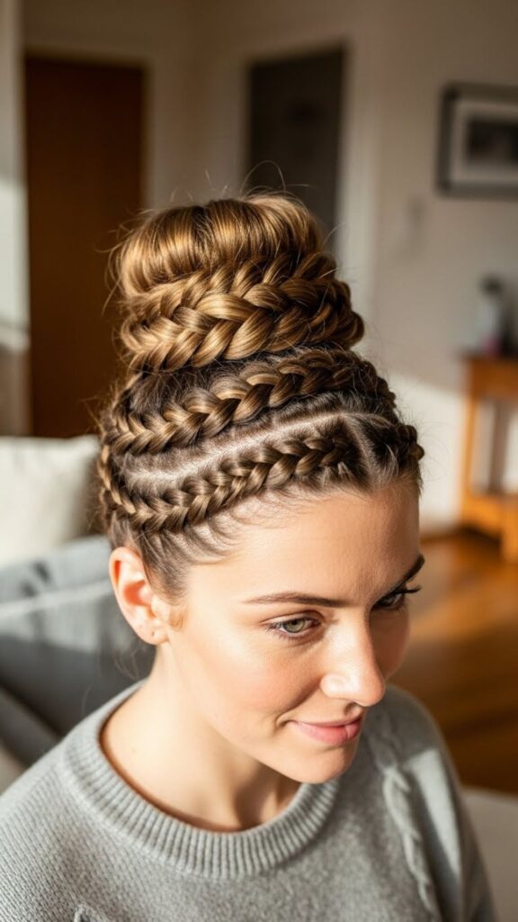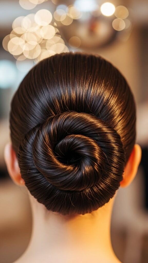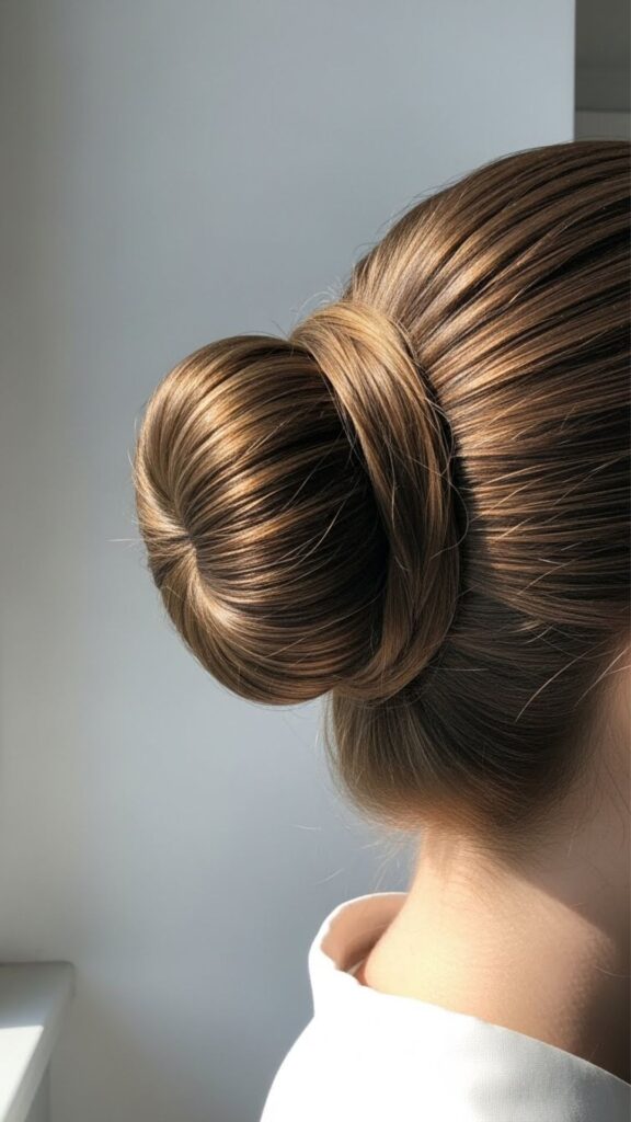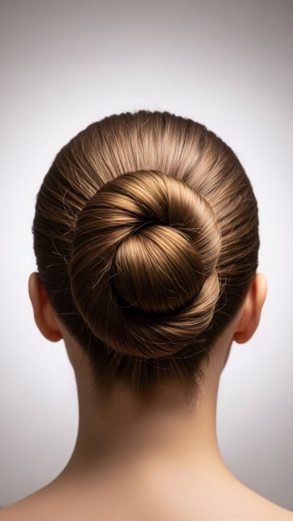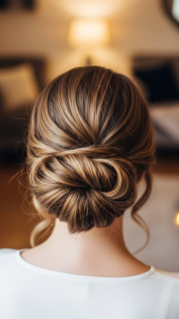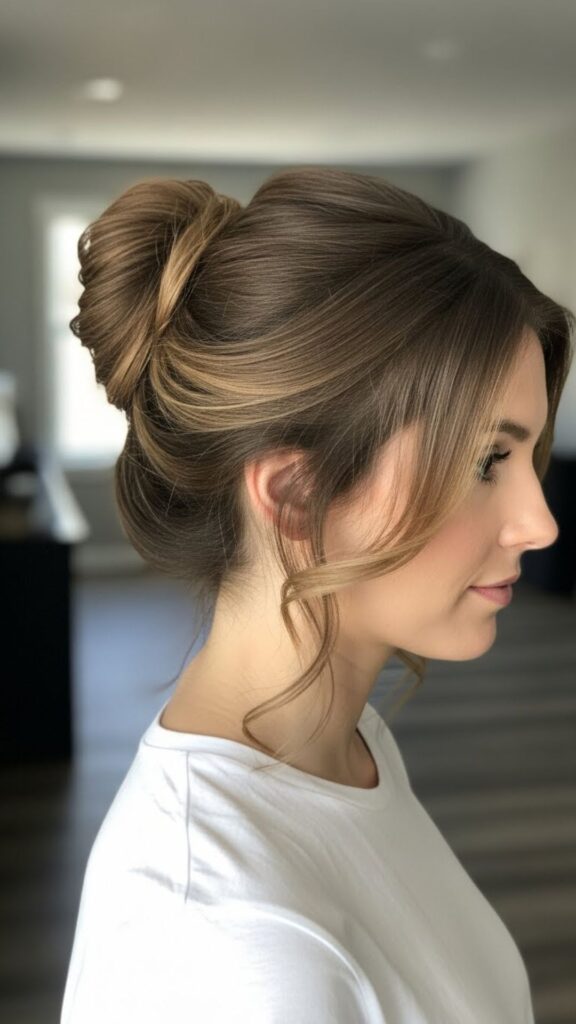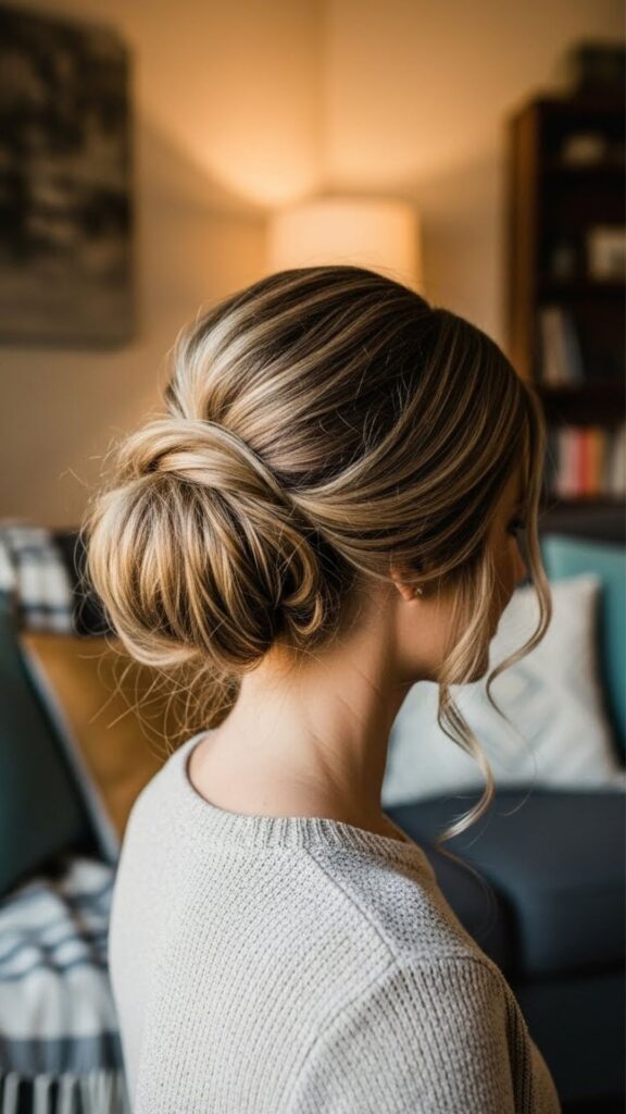 This bun looks fancy but is simple. Start with a low ponytail. Braid the ponytail all the way down. Wrap the braid around the base to form a bun. Secure with pins. The braid adds detail without extra styling time. If you struggle with braiding, do a loose three-strand braid. It does not have to be perfect.