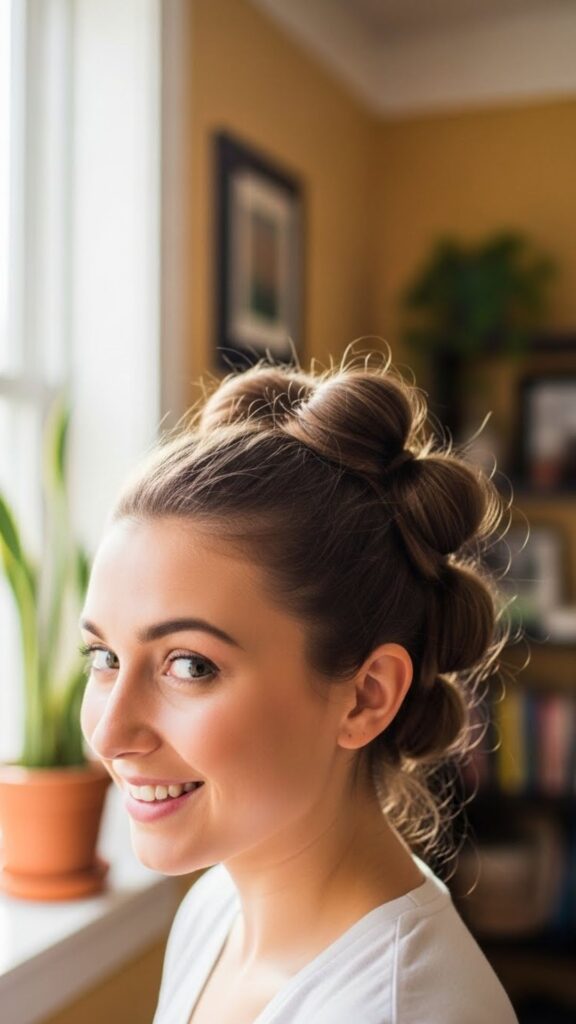 Tie your hair into a ponytail. Add hair ties every two inches down the length. Gently pull each section to make bubbles. Wrap the ponytail into a bun and pin. This style is playful and works for kids and teens. Use colorful elastics you already have. It looks fun without buying accessories.