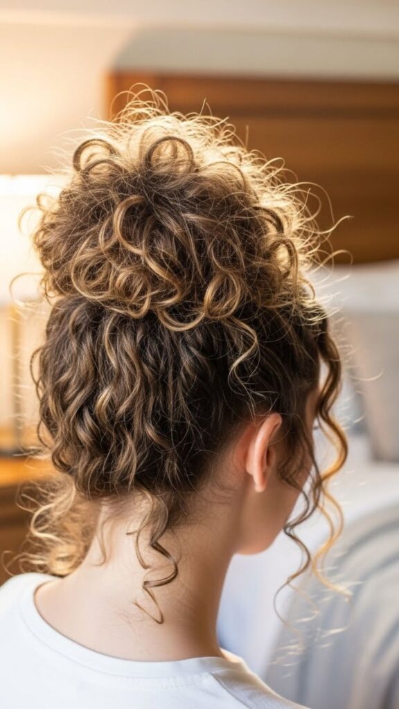 Gather your curls into a high or low bun. Do not brush them out. Use your fingers only. Pin loosely so curls keep their shape. This bun shows off texture and works for natural hair. If curls feel dry, mix a drop of oil with water and smooth lightly. It brings shine back without cost.