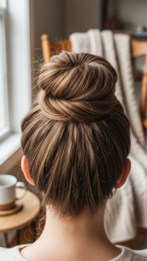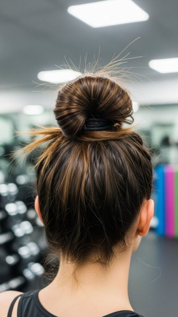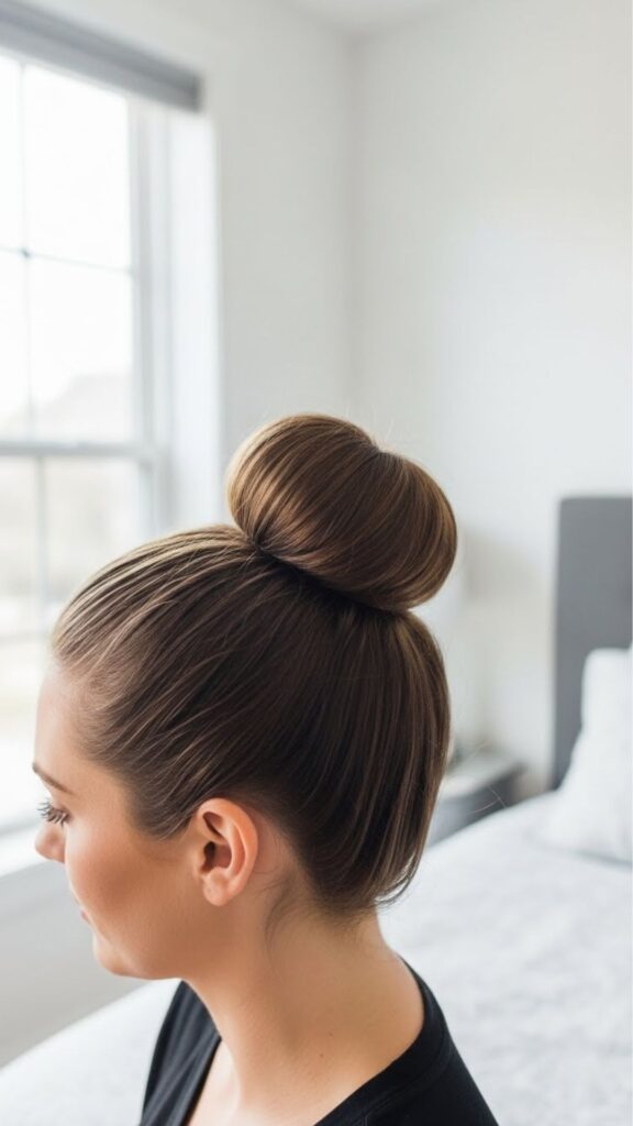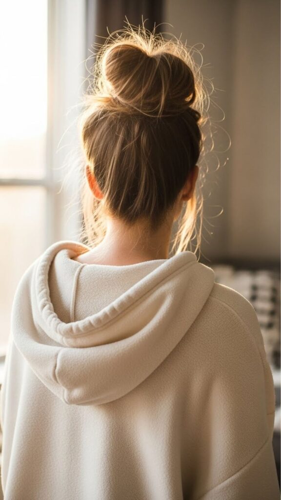 If your hair slips, spray a little water on your hands and smooth it back. It gives grip without a product. This bun is perfect for workouts, grocery runs, and lazy Sundays. You can dress it up with small hoop earrings. If your hair is short, use a small claw clip to hold the bun instead of pins. It is faster and less frustrating.
