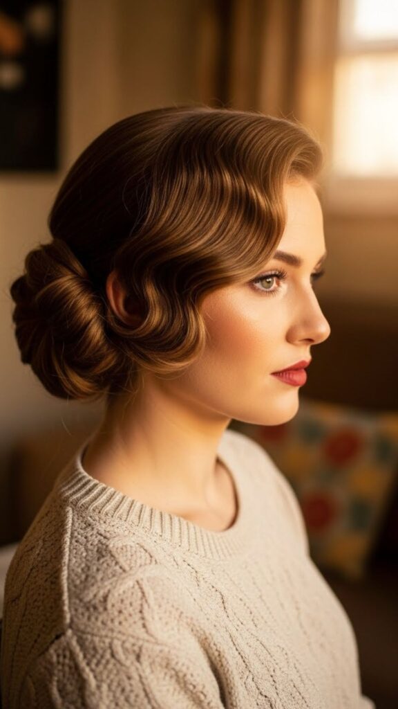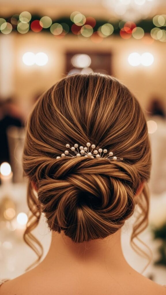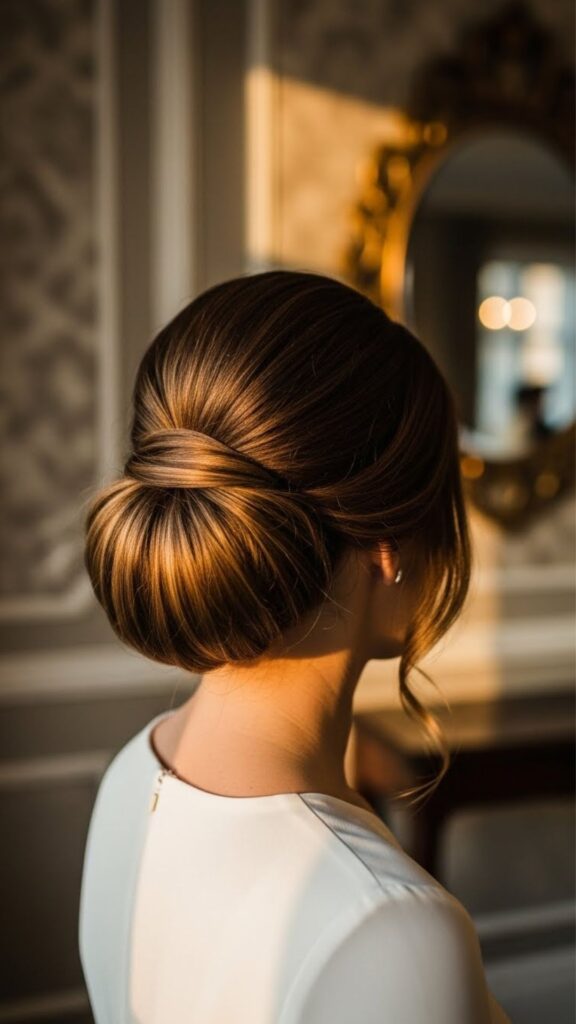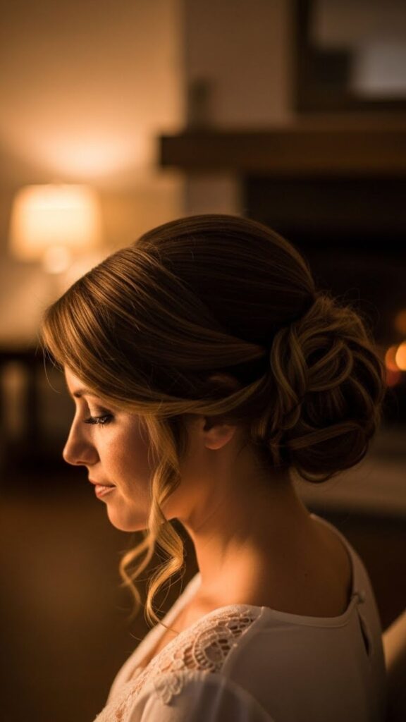 Curl your hair softly. Gather into a low bun. Pin in place and smooth the top. Leave one curled piece near your face. This bun feels graceful and works for dinners and events. You do not need many tools. A few pins and patience are enough.