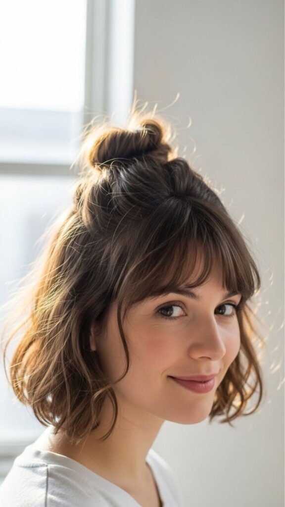 This bun keeps hair out of your eyes while showing your length. Take the top half of your hair and tie it into a small bun. Leave the rest down. Pull the bun slightly to make it fuller. This works for short and long hair. It is great for online meetings and study sessions. If your bun looks tiny, wrap a small scrunchie under it for shape. Scrunchies are cheap and gentle on hair. You can even make one from an old T-shirt. Cut a strip, sew the ends, and thread elastic through it.