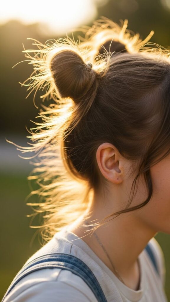 Part your hair down the middle. Make two high ponytails. Twist each into a bun and pin. Space buns are fun and youthful. They work for festivals, picnics, and travel days. If your hair is short, make tiny buns and leave the ends out. It still looks cute. Use clear elastics to keep things neat. For grip, spray a little water on your hands and smooth the hair back. It works like styling gel without cost.